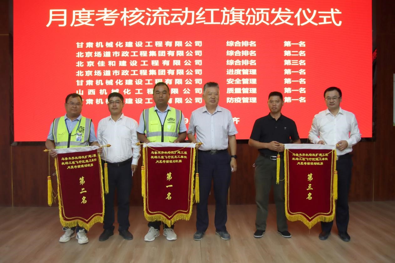 此次會議對施工單位八月份的相關工作進行了綜合考核,我司烏魯木齊機場項目經理部在8家施工單位評比中獲得綜合第一名、安全第一名、防疫第一名的好成績,得到了業主方、擴建指揮部及監理單位的一致認可。同時會議對九月份全場飛行區工程的相關工作進行了部署,下達了各標段施工任務。