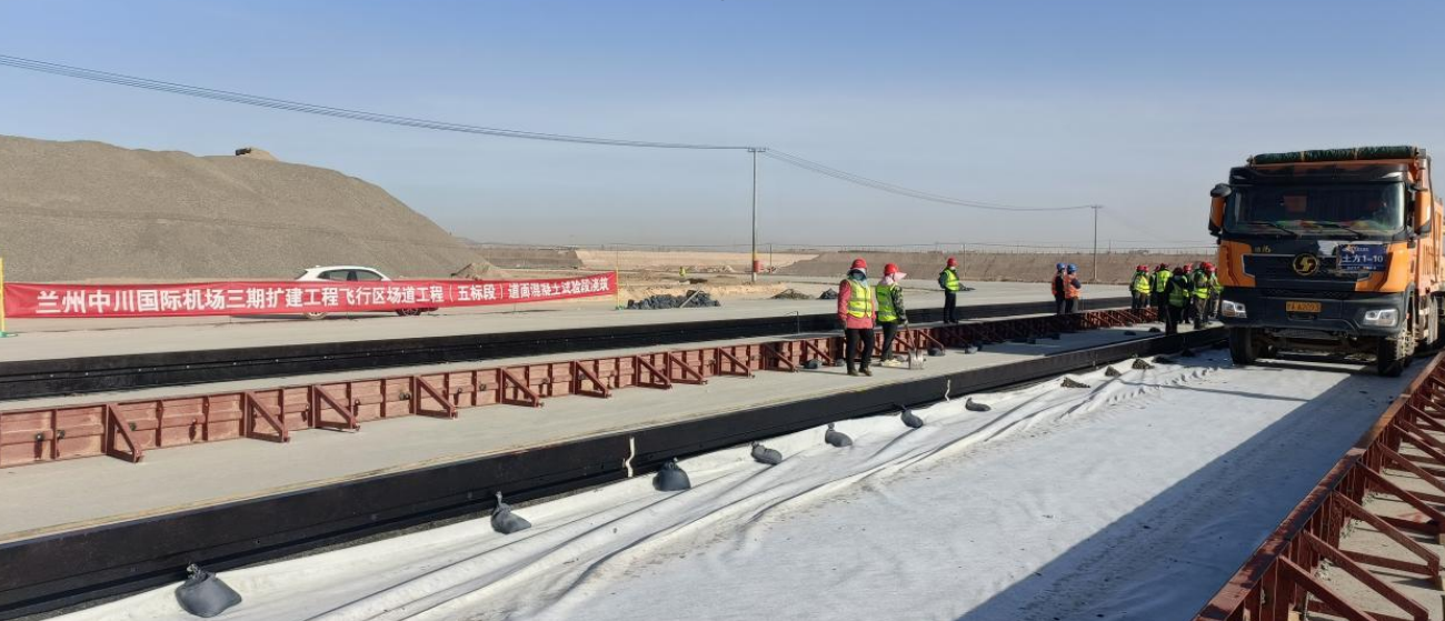 4月20日,由我司承建的蘭州中川國際機場三期擴建工程飛行區場道工程(五標段)道面混凝土試驗段正式開倉澆筑。