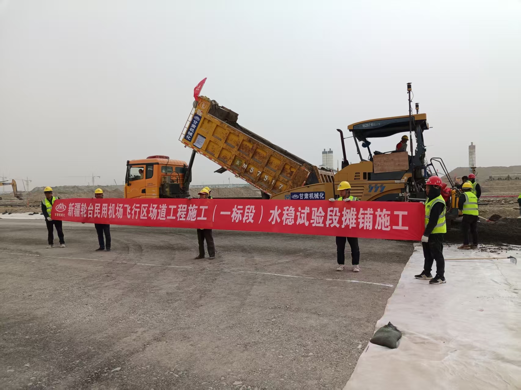 3月27日,新疆輪臺(tái)民用機(jī)場(chǎng)項(xiàng)目現(xiàn)場(chǎng),隨著首車(chē)水泥穩(wěn)定砂礫混合料倒入攤鋪機(jī),其緩緩啟動(dòng),我司承建的該項(xiàng)目飛行區(qū)場(chǎng)道工程(一標(biāo)段)水穩(wěn)基層施工正式開(kāi)啟。